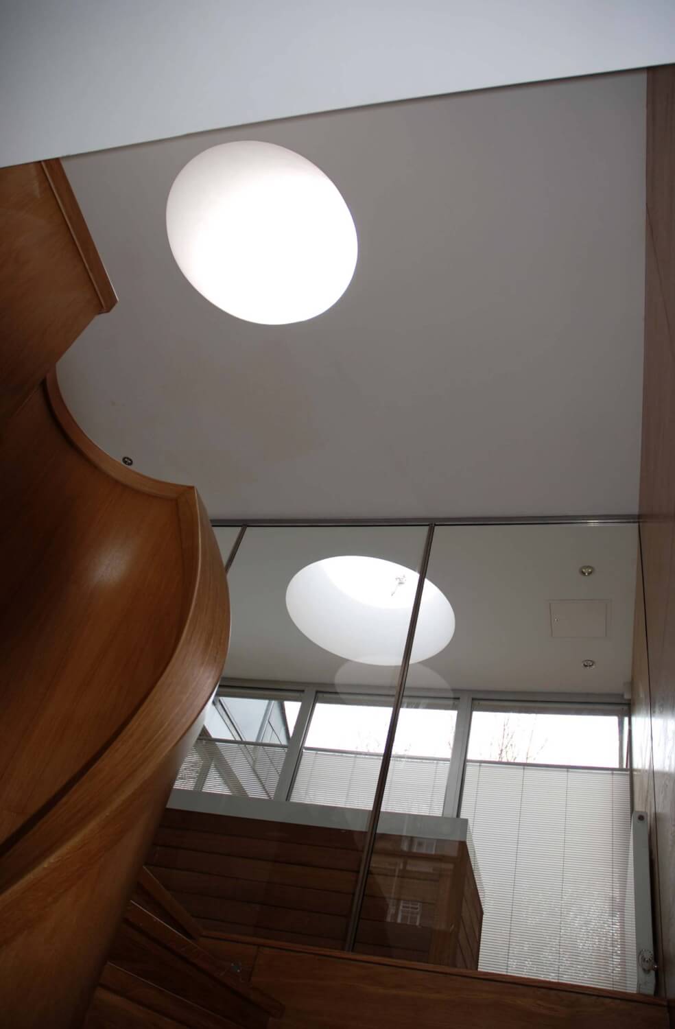 The house had been very oddly re-modelled in the 1960’s. A staircase passed through the living room and rooms lead into one another. The kitchen was a slot and it was dismally dark. A photograph opposite shows the original front. My brief was to increase the accommodation. I made more space for bedrooms by concentrating all circulation off a large timber-lined spiral staircase and extending into part of the rear yard. A roof terrace provided private outdoor space for the master suite and a study area was won from the attic.